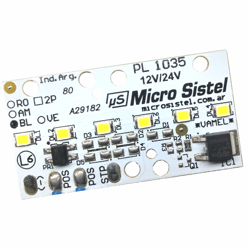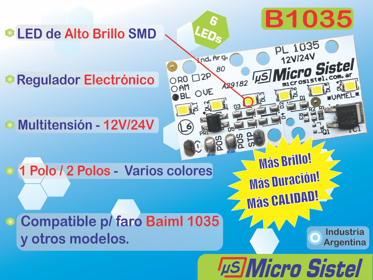 Placa de led para adaptar de manera simple en faros Baiml modelo 1035 / AP400 / AP 430 y otros compatibles. La tendencia mundial en la iluminación eficiente, y sobre todo en vehículos, pone a la iluminación LED como protagonista, y Micro Sistel pone al alcance una placa de led, para adaptar de manera sencilla en el faro, indicado u otro que sea compatible en dimensiones, en reemplazo de la vieja lámpara de filamentos. Las ventajas son claras, menor consumo, menor temperatura de funcionamiento, mayor brillo y color justo para cada ocasión